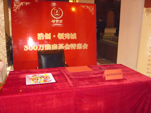 12月18日:由尚正行代理的浩創•領秀城舉辦了300萬購房基金、數百箱購房禮品齊放送活動。凡當天大定客戶都可獲得購房基金和價值三百余元的一套禮品,當場贈送。