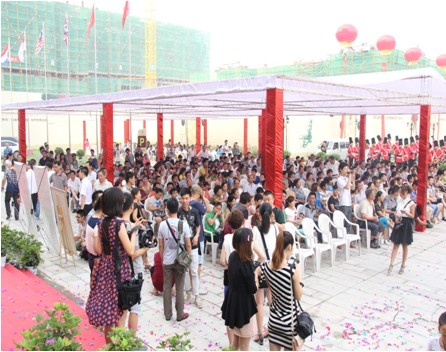 上午八點,開盤儀式正式啟動,舞獅、軍樂隊演奏等一系列活動再一次把休息區客戶們的心情引向高漲,最終,啟動儀式在一聲脆響的擊鑼響聲中宣告結束,客戶們按照認籌順序依次進入等候區,準備選房。