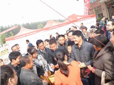 9時,認籌活動準時開始。客戶按照事先排好隊伍,由工作人員引領依次進入售樓中心,繳費、簽約。入口處的工作人員不厭其煩地提示著客戶提前準備好所需錢款與證件,并調(diào)節(jié)人群進入售樓處的速度,保持售樓部內(nèi)不會出現(xiàn)擁擠的現(xiàn)象。現(xiàn)場雖然忙碌,卻并不慌亂。完成認籌流程的客戶,則三五成群聚集于售樓中心門前的廣場,等候抽獎活動的開始。