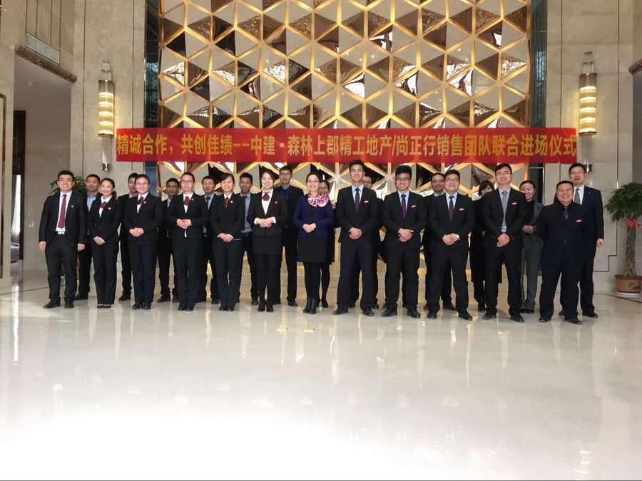 上午9:30分,中建森林上郡——尚正行、精工地產銷售團隊聯合進場儀式正式開始,所有與會人員在售樓部大廳整齊列隊,主持人首先致開場白,隆重介紹歡迎各位領導嘉賓的到來,并隆重介紹了與會的各位嘉賓、領導。