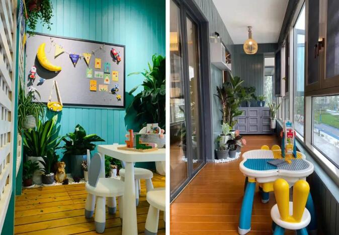 雙蕊:它的陽臺基本上都是連接著客廳還有臥室,至少是兩個空間都連接了陽臺,整個陽臺下來,它的面寬大概到十幾米,其實它這個陽臺我比較喜歡的是,它是北向和南向都有陽臺,北邊的陽臺,比如說家里邊平常洗個衣服,放個洗衣機可以放北邊,雜物也可以放北邊。南邊的話就完全用于個人生活,比如說家里邊比較有情調的你可以在南陽臺做個小花園,種個小花小草的;有孩子的話,你可以做兒童平常游樂的地方,放一些玩具、讀書,做讀書角。直接把玩具柜做到墻上,玩完了往柜子里一放。這樣客廳也可以保持整潔。