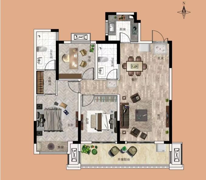 ②南北雙陽臺,修身養(yǎng)性區(qū),家政區(qū)、健身區(qū),雜物放置區(qū),滿足家人不同需求;